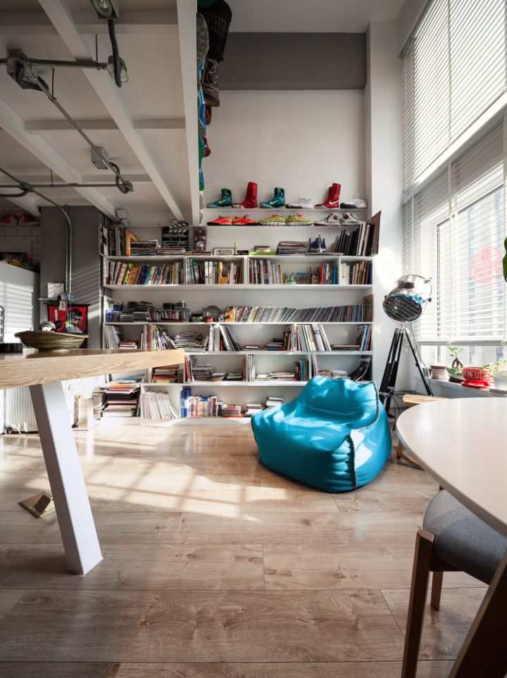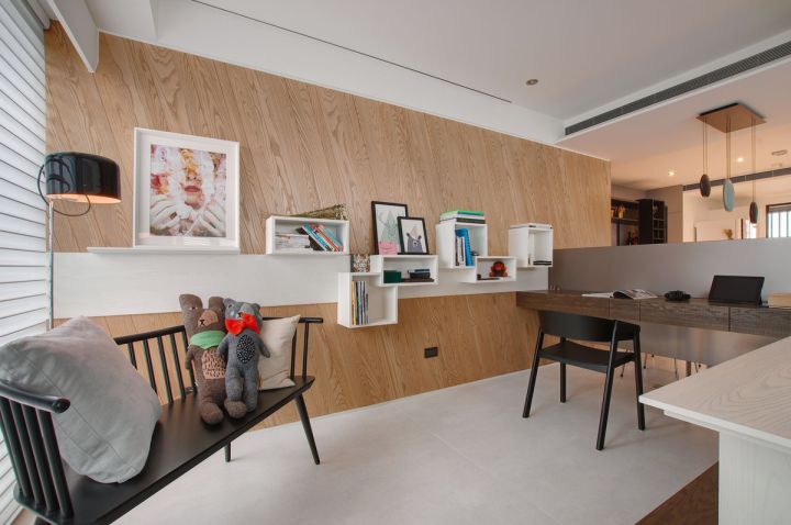 如果客廳還要兼做工作區(qū),就要考慮書桌書柜的位置;