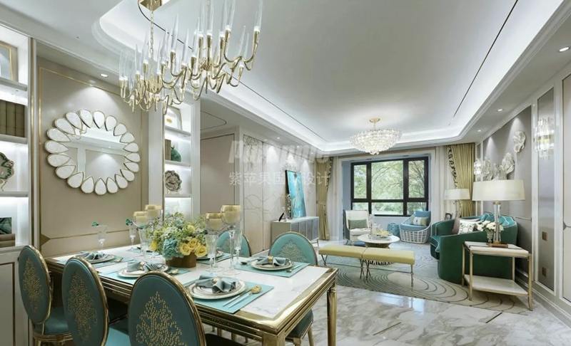 本案戶型方正,動(dòng)線明朗,因此設(shè)計(jì)時(shí)在結(jié)構(gòu)上未做過(guò)大調(diào)整??臻g整體以白色與米色大面積渲染,同時(shí)穿插少許奢華的金色點(diǎn)綴空間,整體色調(diào)更加豐富而高級(jí)。地板選擇了大理石系,軟裝則以藍(lán)色色系修飾空間,通過(guò)色系的延伸,保持空間跳色風(fēng)格的連貫性。