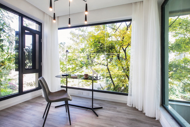 設(shè)計(jì)師在與業(yè)主充分溝通后,決定在整體上采用現(xiàn)代風(fēng)格略帶輕奢的設(shè)計(jì)元素。在設(shè)計(jì)過(guò)程中,用大量玻璃代替實(shí)墻,引光入室,并把景觀帶入室內(nèi),配以紗簾調(diào)整光影,讓采光明亮卻也柔和舒適,本案雖為經(jīng)典的黑白灰配色,但是因?yàn)橛辛俗匀还饩€的引入,一掃黑灰?guī)?lái)對(duì)的暗沉,顯得整體空間通透敞亮,現(xiàn)代時(shí)尚。