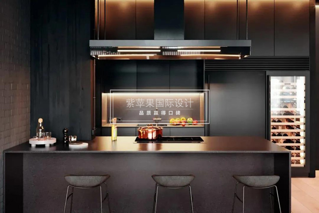 ▲廚房采用了全黑的設(shè)計,用暖色的光帶,在炫酷中帶來溫暖。