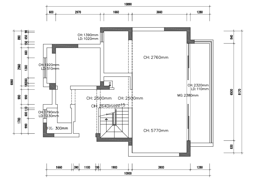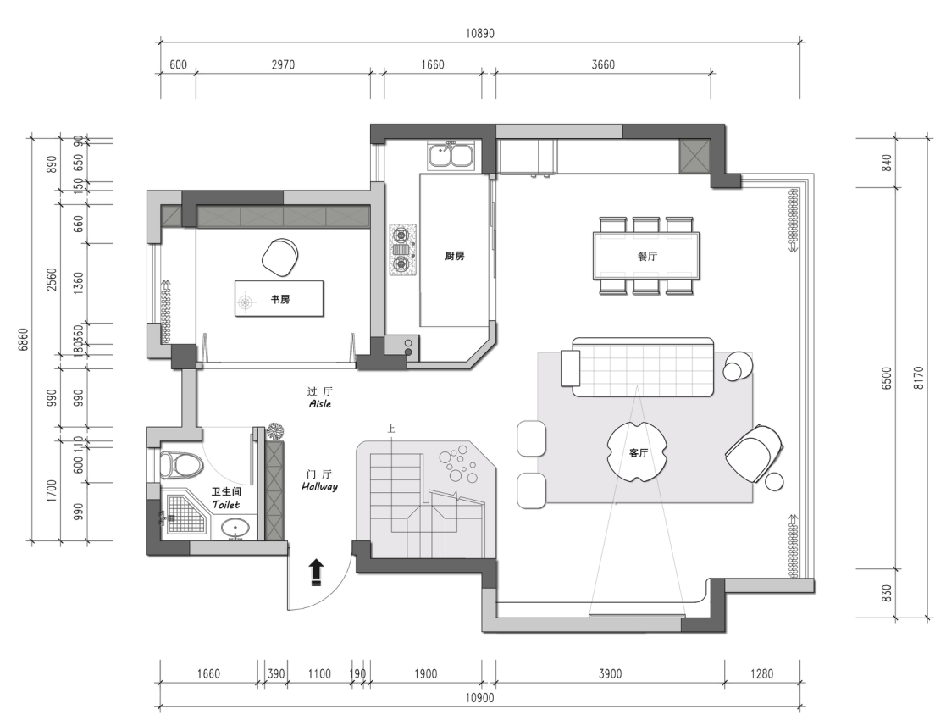 別墅裝修①一層的原始空問過于零碎,設(shè)計(jì)師將衛(wèi)生間外拓,讓北邊空間整齊方正,樓梯太過狹窄,重新規(guī)劃了尺寸,行走更加舒服,陽臺(tái)打通,連在一起的客餐,客廳對(duì)面做了一個(gè)開放式書房。