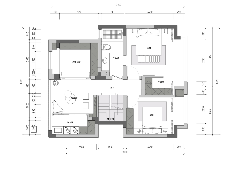 個(gè)次臥,外面也做了一個(gè)千濕分離的衛(wèi)生間。樓梯上來也有一個(gè)互動(dòng)多功能廳。
