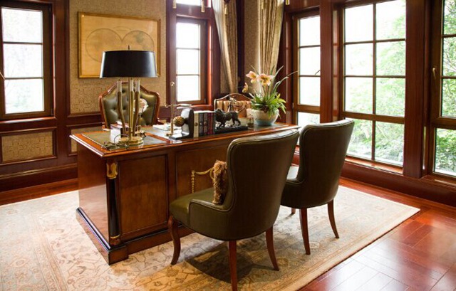 書(shū)房主要是用來(lái)辦公的,所以書(shū)房里的家具不會(huì)太多,但造型都比較大型。在這張別墅裝修設(shè)計(jì)效果圖中的辦公家具同樣是實(shí)木質(zhì)材,這些實(shí)木制材會(huì)有很明顯的一些帶有復(fù)古情懷的雕花、造型也是顯得非常端莊古樸大方。美式田園風(fēng)格的突顯出來(lái)的收納柜是采用的多種形式的,也不是擁有無(wú)數(shù)小格的開(kāi)放式柜子,而是安上透明玻璃有作展示用的櫥柜,在書(shū)柜中放置一些收藏品可以為整個(gè)空間增添歷史感。