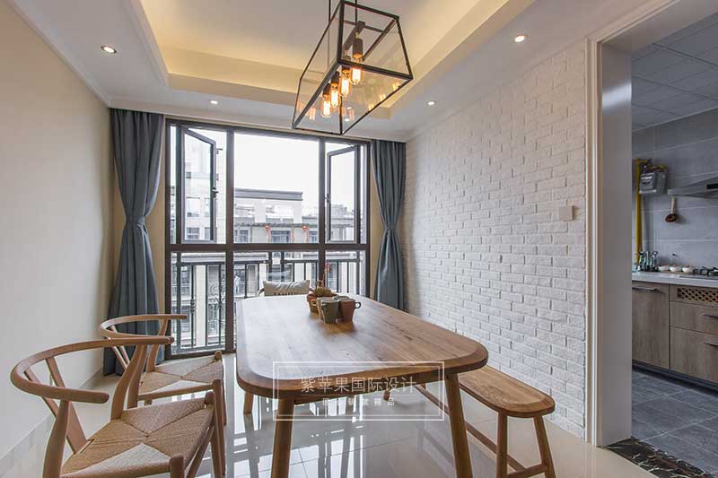 客廳空間一塵不染、素凈澄明。背景墻使用磚元素,配合家具的木頭,棉麻材質,營造自然,隨意,干凈的氛圍,這里是主人于喧囂都市里的一片精神凈土。